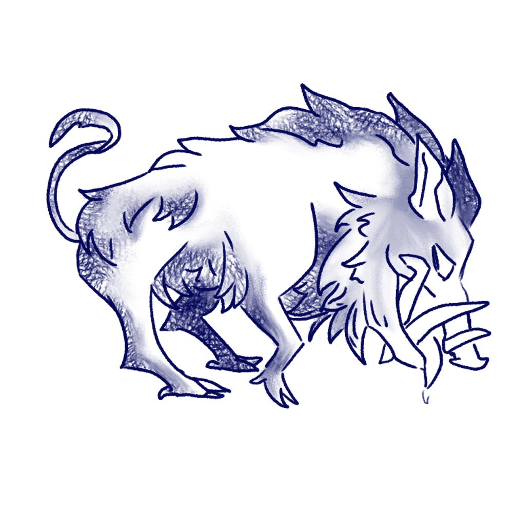 Physical Description: Large, cloven-hooved creatures with stubby legs, shorter than a horse, but stronger, built for endurance rather than speed. Their flattened, bony heads, give them the appearance of a boar, while their long and tapered muzzles are filled with sharp, pointed teeth that can tear flesh with ease. Their bodies are covered by coarse hair that tufts along their back.